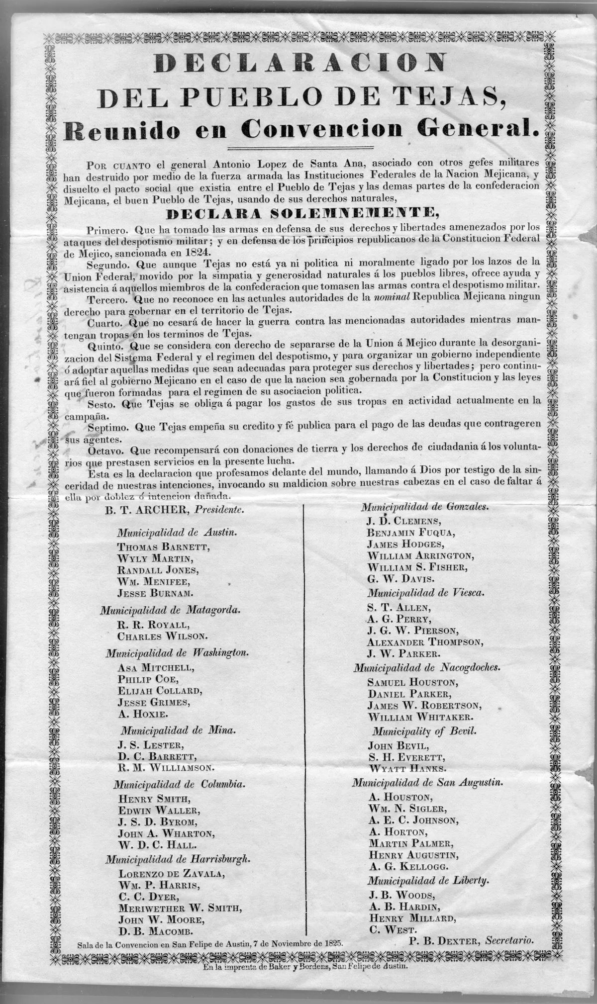 Debate was sharp. Some members pressed for outright secession, while others feared alienating potential allies in other Mexican states and preferred to defend constitutional order. The convention ultimately sought a middle path. On November 7, 1835, it issued a “Declaration to the Public,” in Spanish, stating that Texans had taken up arms to defend their rights and liberties against “military despots” and to uphold republican principles under the 1824 constitution—yet reserving the right to form an independent government.