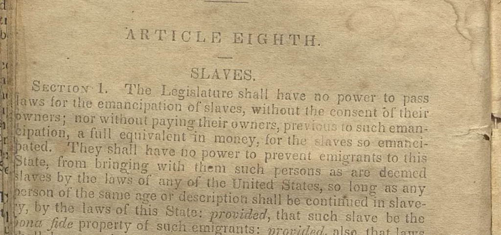 Article VIII prohibited the Legislature from emancipating enslaved persons without the consent of the owner and from prohibiting the immigration of slaveholders into the state. Enslaved persons were explicitly treated as legal property, and their status as such was constitutionally protected. The document thus entrenched slavery within the legal order, aligning Texas firmly with the Southern slaveholding states at a time of growing national conflict over the institution.