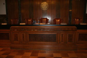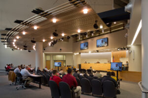 Meeting of the five members of the commissioners court in Comal County, Texas, in the historic county courthouse (2024).