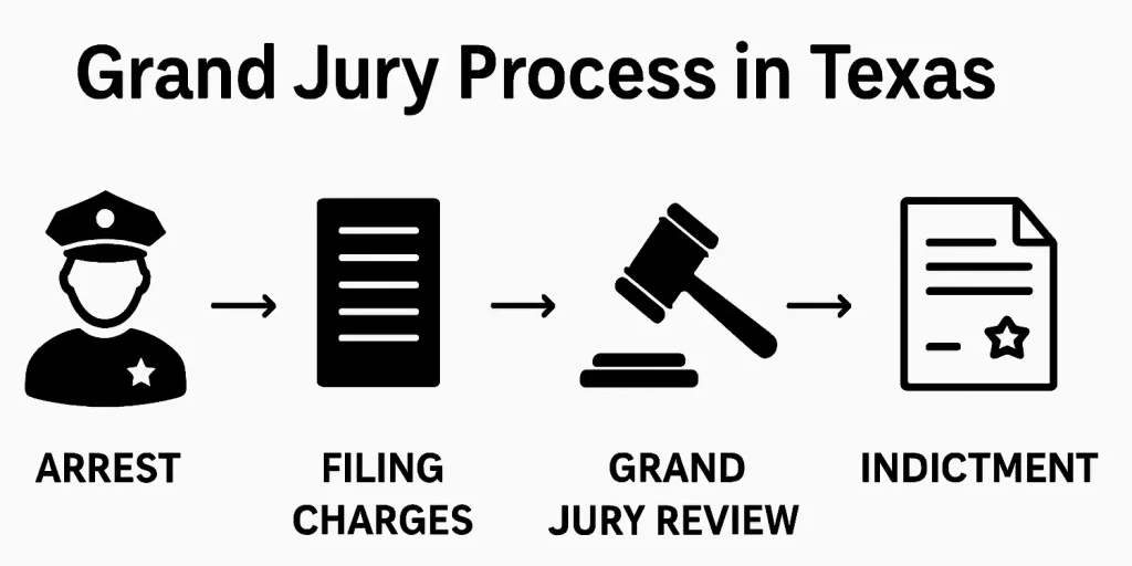 For felony charges, Texas law requires review by a grand jury. A grand jury is a group of 12 citizens who meet in private to evaluate evidence presented by prosecutors. Unlike a trial jury, the grand jury does not decide guilt or innocence. Instead, they determine whether there is “probable cause” to believe a crime was committed and the accused person is responsible.