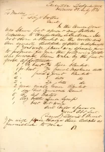 Burnet asked them to send him ten blankets, a dozen canvassed hams, baking soda, a dozen bottles of lemon syrup, and a bottle of Port wine. Toby and Brother Company, led by two New Orleans businessmen, had recently been made the purchasing agent of the Republic of Texas in New Orleans. The letter (right) sheds light on the domestic life of one of Texas’ leading statesmen at a time of turmoil in the young republic.