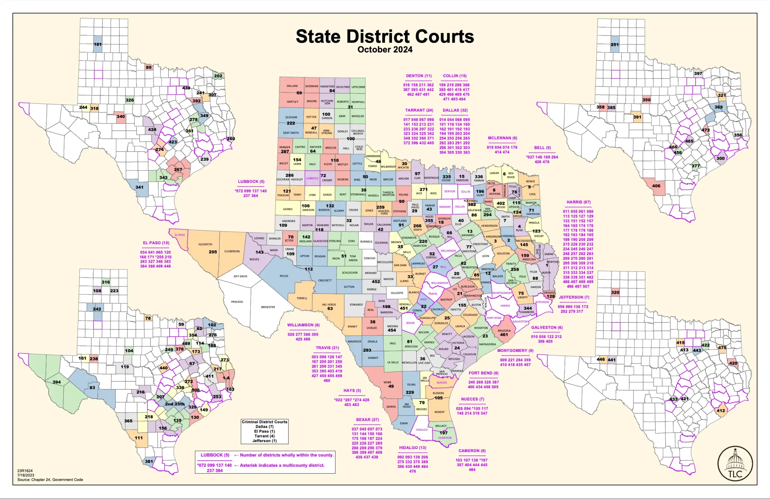 Each district court serves a geographical area consisting of one or more counties. As of January 2025, Texas had 504 district courts, according to the Office of Court Administration.