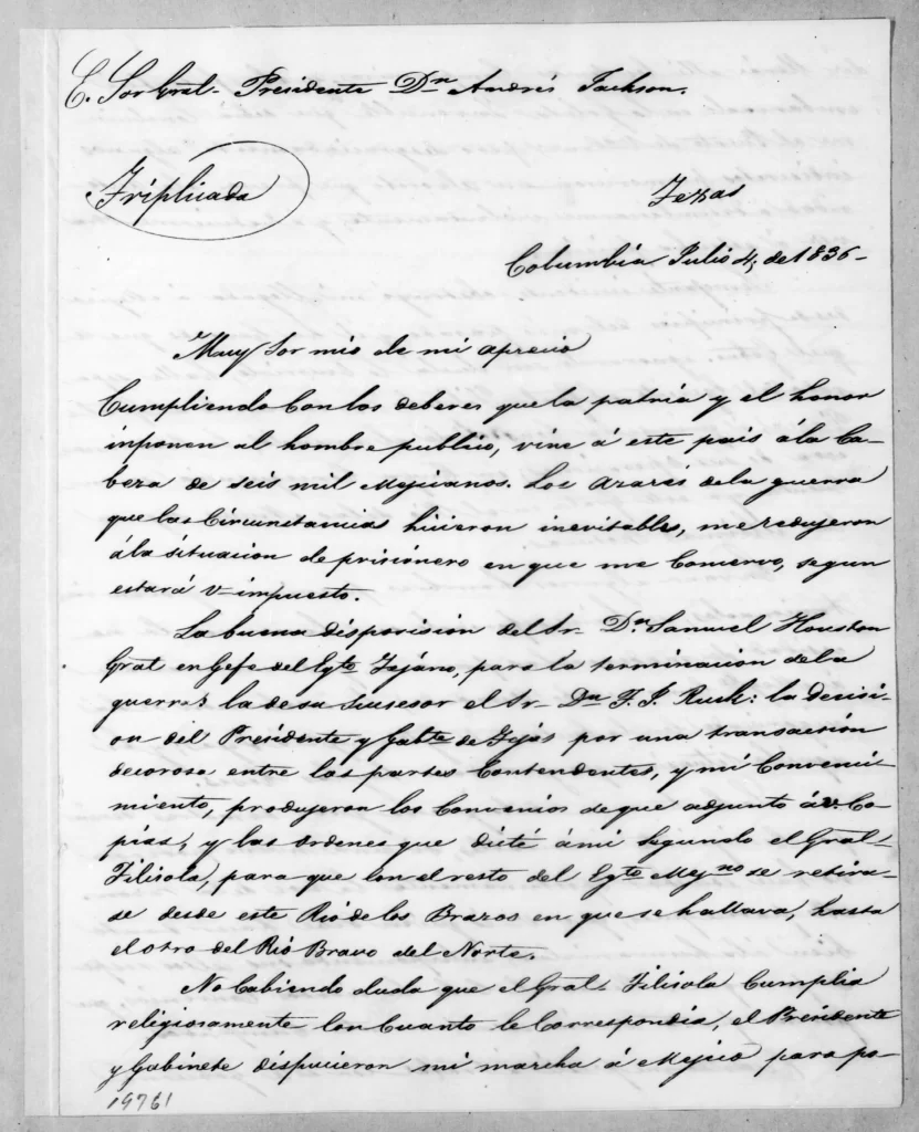 On July 4, 1836, Santa Anna addressed a letter to U.S. President Andrew Jackson, appealing for American assistance in securing peace and, implicitly, his release from imprisonment. The letter shows a conciliatory Santa Anna—once feared in Texas—now trying to present himself as a man of reason and peace.