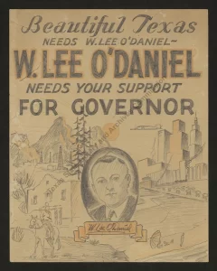Wilbert Lee “Pappy” O’Daniel served as Texas governor from 1939 to 1941 and as a U.S. Senator from 1941 to 1949. A businessman-turned-radio-host, O’Daniel is best remembered for his unusual political style: a mix of homespun religiosity, anti-politician rhetoric, and musical populism.